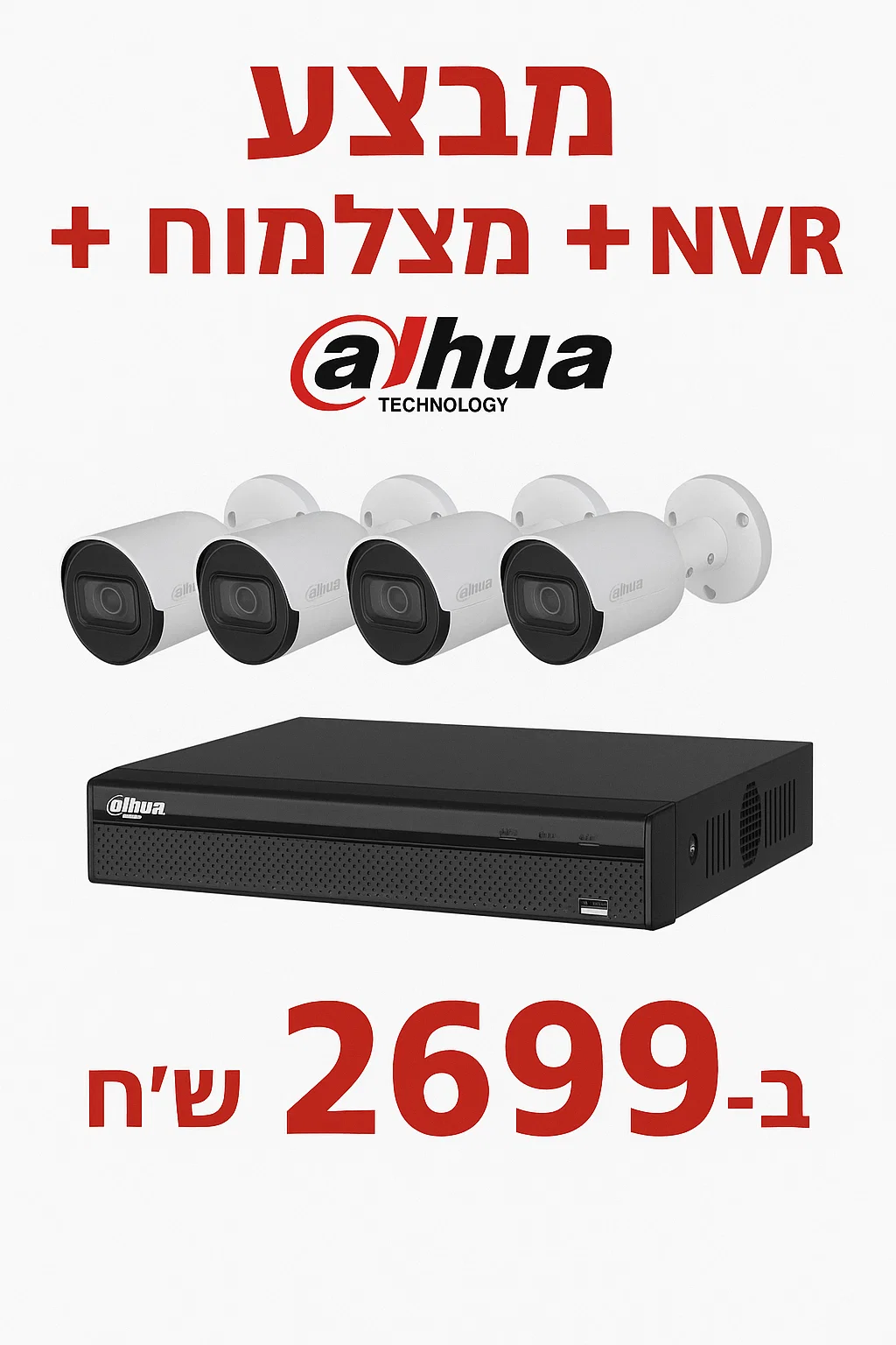 קיט הכולל 4 מצלמות רשת ברזולוציית 4MP מדגמי Dahua (DH-IPC-HDW2449T‑S‑IL / IPC‑HFW2449S‑S‑IL) עם טכנולוגיית Dual Light חכמה, לביצועים מצוינים בתנאי תאורה חלשים, יכולות אנליטיקה חכמה והגנה מלאה.